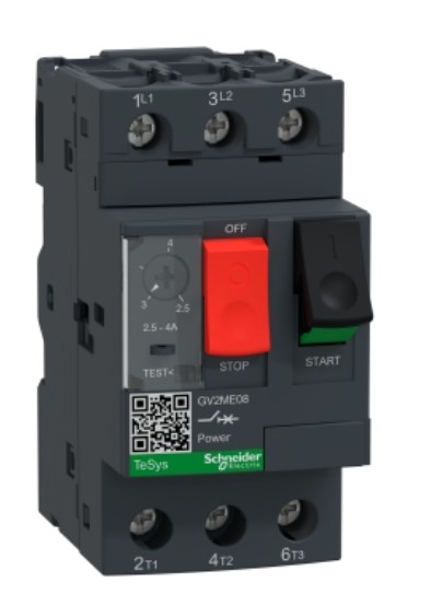 Le Schneider Electric GV2ME08C (faisant partie de la gamme TeSys Deca) est un disjoncteur-moteur magnéto-thermique tripolaire conçu pour la protection et la commande des moteurs. Il offre une plage de réglage thermique allant de 2,5 à 4 A.