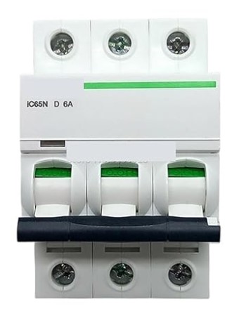 disjoncteur miniature (MCB) de Schneider Electric. Il s’agit d’un dispositif de protection triphasé (3 pôles) conçu pour des courants nominaux de 6 ampères avec une courbe de déclenchement de type D, idéale pour les charges à fort courant d’appel